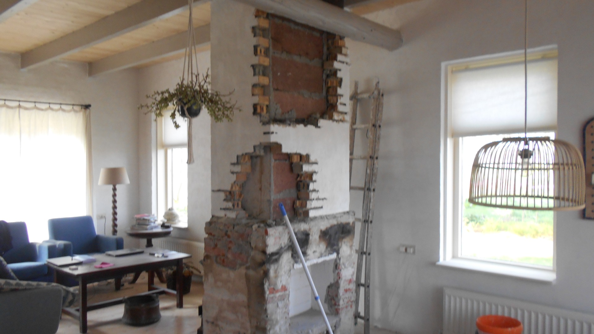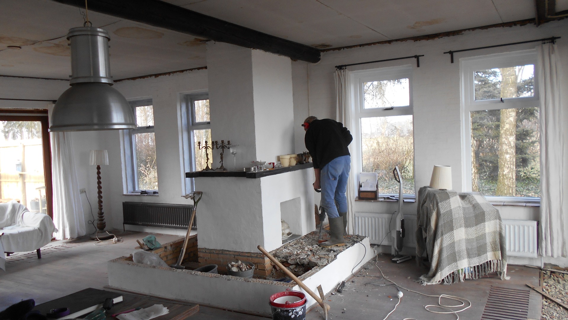 De kamer wordt geïsoleerd met schuimbeton. De vloer en balken worden afgebroken, de ruimte wordt verlaagd van 28 cm naar 40 centimeter, Er kwamen allerlei muurtjes tevoorschijn. Die zijn gesloopt en de leidingen van de centrale verwarming zijn deels weggehaald en deels vervangen door kunststof leidingen